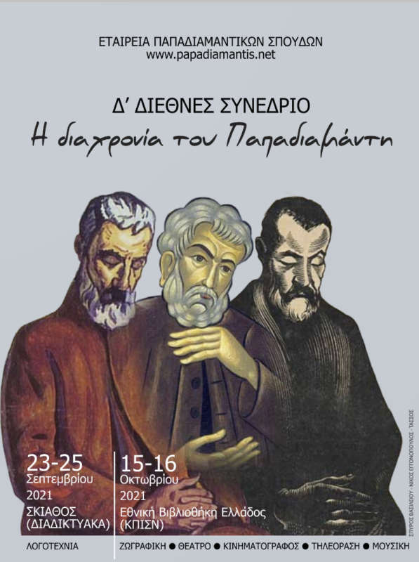 Η Εταιρεία Παπαδιαµαντικών Σπουδών αποφάσισε να οργανώσει το Δ΄ Διεθνές Συνέδριο για τον Αλέξανδρο Παπαδιαµάντη (1851-1911) και το έργο του, ακολουθώντας την ανά δεκαετία διεξαγωγή του, µε αφετηρία το 1991 (Πρακτικά των προηγούµενων Συνεδρίων: www.papadiamantis.net). Το συνέδριο θα γίνει στις 23-25 Σεπτεμβρίου (Σκιάθος, διαδικτυακά) και 15-16 Οκτωβρίου στην Εθνική Βιβλιοθήκη. Θέμα: Η διαχρονία του Παπαδιαµάντη.