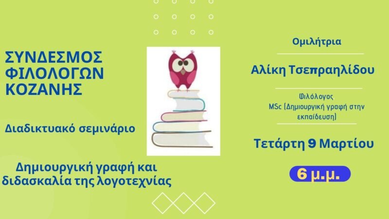 Ο Σύνδεσμος Φιλολόγων Κοζάνης, ανταποκρινόμενος στο αίτημα για ουσιαστική και διαρκή επιμόρφωση των εκπαιδευτικών πάνω στις πρακτικές διδακτικές ανάγκες και προκλήσεις που προκύπτουν, διοργανώνει ΔΙΑΔΙΚΤΥΑΚΟ ΕΠΙΜΟΡΦΩΤΙΚΟ ΣΕΜΙΝΑΡΙΟ την Τετάρτη 9 Μαρτίου και ώρα 6μ.μ., με προσκεκλημένη τη φιλόλογο Αλίκη Τσεπραηλίδου, με θέμα:
