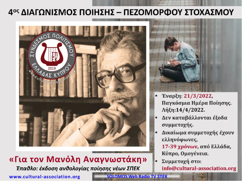 Ο Σύνδεσμος Πολιτισμού Ελλάδας Κύπρου / ΣΠΕΚ προκηρύσσει 4ο Διαγωνισμό ποιήματος ή πεζόμορφου ποιητικού στοχασμού μεταξύ νέων (ηλικίας 17-39 χρόνων) αφιερωμένο στον σημαντικό ποιητή του Ελληνισμού, Μανόλη Αναγνωστάκη.