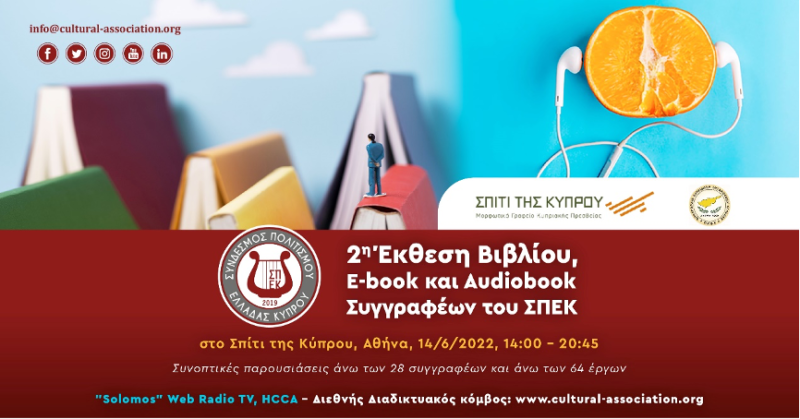 Το Σπίτι της Κύπρου, η Ομοσπονδία Κυπριακών Οργανώσεων Ελλάδος (Ο.Κ.Ο.Ε.) και ο Σύνδεσμος Πολιτισμού Ελλάδας Κύπρου (ΣΠΕΚ) προσκαλούν το φιλαναγνωστικό κοινό την Τρίτη 14 Ιουνίου 2022 και ώρα 14:00-20:45 στο Σπίτι της Κύπρου, Ξενοφώντος 2Α, 105 57 – Αθήνα, στη «2η Έκθεση Βιβλίου, E–book και Audiobook Συγγραφέων του ΣΠΕΚ» με συνοπτική παρουσίαση των έργων τους. Συγκεκριμένα, θα παρουσιαστούν άνω των 28 συγγραφέων από Ελλάδα, Κύπρο, Ομογένεια, και άνω των 64 έργων. Πρόκειται για πολυτελείς, σύγχρονες έντυπες εκδόσεις ποίησης, πεζογραφίας (μυθιστορήματα, διηγήματα, αφηγήματα), δοκιμίων, χρονογραφημάτων, θεάτρου, οδοιπορικών, ιστορικών μελετών, παιδικής και νεανικής λογοτεχνίας, αλλά και αντίστοιχης θεματολογίας υπερσύγχρονες ηλεκτρονικές εκδόσεις, eBook και Audiobook, οι οποίες προσφέρονται ελεύθερα και δωρεάν μέσα από τον διαδικτυακό κόμβο του Συνδέσμου Πολιτισμού Ελλάδας Κύπρου www.cultural-association.org. Παράλληλα, νέες και νέοι από την «Πτέρυγα Νέοι ΣΠΕΚ», θα απαγγείλουν έργα τους, με τα οποία συμμετέχουν στις ανθολογίες του ΣΠΕΚ, για τον Γιάννη Ρίτσο, την Κική Δημουλά και τον Τάσο Λειβαδίτη. Η εκδήλωση θα ολοκληρωθεί με εκλεκτό μουσικό αφιέρωμα: πιάνο – Δ. Ντουρουντά, φωνή – Ι. Ρουκάς. Κατά τη διάρκεια της εκδήλωσης τα έργα των συγγραφέων θα διατίθενται, ενυπόγραφα, σε φιλική τιμή. Μεταξύ των συγγραφέων συμμετέχουν οι: Ι. Ιωσηφίδης, Α. Ονουφρίου, Κ. Πουλχερίου, Σ. Σιγιουλτζή-Ρουκά, Ε. Πλουτάρχου, Γ. Τζιβράς, Α. Συμεού, Ν. Νεοκλέους, Λ. Αριστοδήμου, Γ. Πετούσης, Ά. Τενέζη, Σ. Χριστοδούλου, Μ. Λάμπρου, Μ. Πανάγου, Σ. Γρηγοριάδης, Μ. Μιχαήλ, Κ. Δράκου, Σ. Ηλία, Μ. Χατζηευσταθίου, Ι. Μετόχη, Ε. Ελευθερίου, Ε. Γκλιάτη, Σ. Μίχου, Μ. Συμεωνίδης, Κ. Γκόζιας, Χ. Βαρσάμογλου, Α. Μπεζάνης, Α. Χειμαριώτη, Σ. Κωνσταντής, Δ. Χριστοδούλου, Ι. Καραμαλή, Ε. Προκοπίου, Ν. Παπαδοπούλου, Ρ. Ιωαννίδου-Σταύρου κ.ά. Η εκδήλωση θα προβάλλεται και απευθείας διαδικτυακά μέσα από το https://diavlos.grnet.gr/room/1607?eventid=12161