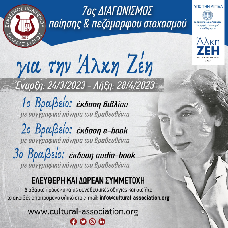 7ος Διαγωνισμός Ποίησης – Πεζόμορφου Στοχασμού «Για την Άλκη Ζέη» από τον Σύνδεσμο Πολιτισμού Ελλάδας Κύπρου, υπό την αιγίδα του Υπουργείου Πολιτισμού της Ελλάδος