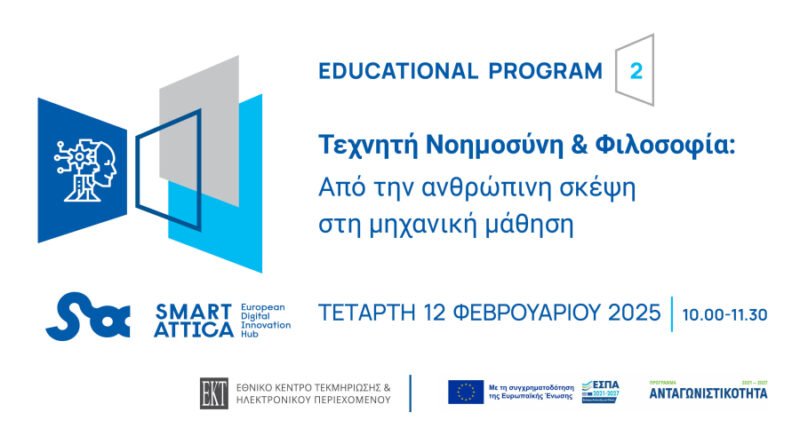 Το Εθνικό Κέντρο Τεκμηρίωσης & Ηλεκτρονικού Περιεχομένου (ΕΚΤ), μέλος του Ευρωπαϊκού Κόμβου Ψηφιακής Καινοτομίας Smart Attica EDIH, διοργανώνει εκπαιδευτικό πρόγραμμα με τίτλο: «Τεχνητή Νοημοσύνη & Φιλοσοφία: Από την ανθρώπινη σκέψη στη μηχανική μάθηση» την Τετάρτη 12 Φεβρουαρίου 2025 (10.00 – 11.30) διαδικτυακά.