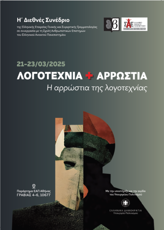 Το Η΄ Διεθνές συνέδριο της Ελληνικής Εταιρείας Γενικής και Συγκριτικής Γραμματολογίας, με θέμα «Λογοτεχνία και αρρώστια – Η αρρώστια της λογοτεχνίας», σε συνεργασία με τη Σχολή Ανθρωπιστικών Επιστημών του Ελληνικού Ανοικτού Πανεπιστημίου, θα πραγματοποιηθεί 21-23 Μαρτίου στην Αθήνα (παράρτημα του ΕΑΠ, Γραβιάς 4-6) υπό την αιγίδα του Υπουργείου Πολιτισμού.