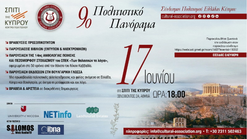 Ο Σύνδεσμος Πολιτισμού Ελλάδας Κύπρου (ΣΠΕΚ), στο πλαίσιο του ετήσιου θεσμού του, διοργανώνει το 9ο Πολιτιστικό Πανόραμα την Τρίτη 17 Ιουνίου 2025 στις 18:00, στο Σπίτι της Κύπρου, τον φιλόξενο χώρο της Πρεσβείας της Κυπριακής Δημοκρατίας στην Αθήνα. Μια κορυφαία πολιτιστική σύμπραξη που ενώνει δημιουργούς, στοχαστές και προσωπικότητες από Ελλάδα, Κύπρο, Απόδημο Ελληνισμό και φιλέλληνες του εξωτερικού.
