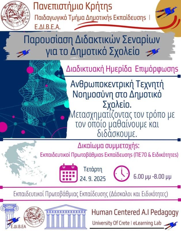 Το Παιδαγωγικό Τμήμα Δημοτικής Εκπαίδευσης του Πανεπιστημίου Κρήτης και το Εργαστήριο Προηγμένων Μαθησιακών Τεχνολογιών στη Δια Βίου και Εξ Αποστάσεως Εκπαίδευσης (Ε.ΔΙ.Β.Ε.Α.) σας προσκαλούν σε διαδικτυακή ημερίδα επιμόρφωσης με θέμα «Ανθρωποκεντρική Τεχνητή Νοημοσύνη στο Δημοτικό Σχολείο: Μετασχηματίζοντας τον τρόπο με τον οποίο μαθαίνουμε και διδάσκουμε».