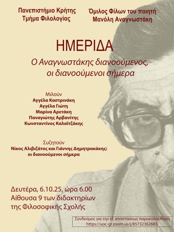 Με αφορμή την επέτειο των εκατό χρόνων από τη γέννηση και των είκοσι χρόνων από τον θάνατο του Μανόλη Αναγνωστάκη (1925-2005), το Τμήμα Φιλολογίας του Πανεπιστημίου Κρήτης και ο Όμιλος Φίλων του ποιητή Μανόλη Αναγνωστάκη διοργανώνουν τη Δευτέρα 6 Οκτωβρίου 2025 και ώρα 18.00, ημερίδα με θέμα: