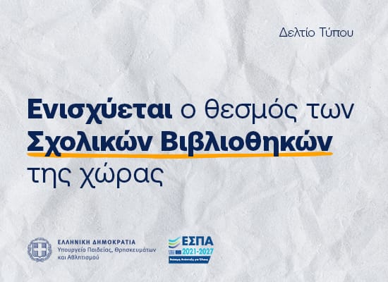 Από το πρόγραμμα «Ενίσχυση και Εμπλουτισμός των Σχολικών Βιβλιοθηκών» του ΕΣΠΑ 2021–2027 θα διατεθεί το ποσό των 60 εκατ. ευρώ, για τη δημιουργία, μεταξύ άλλων, συλλογών βιβλίων έως 2.000 τίτλων, εμπλουτισμό των υφιστάμενων, πρόσληψη 400 βιβλιοθηκονόμων από τον Σεπτέμβριο του 2026, σχεδίαση και λειτουργία ενός Εθνικού Δικτύου Σχολικών Βιβλιοθηκών με τη συμμετοχή εκπαιδευτικών, μαθητών, γονέων.