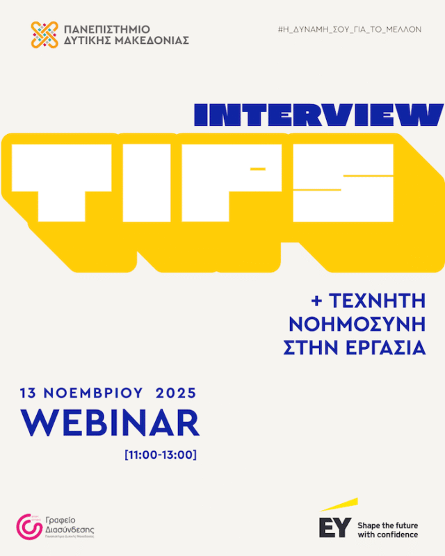 Το Γραφείο Διασύνδεσης του Πανεπιστημίου Δυτικής Μακεδονίας, σε συνεργασία με την ΕΥ, διοργανώνει διαδικτυακή εκδήλωση με θέμα «Τεχνητή Νοημοσύνη & Interview Tips», την Πέμπτη 13 Νοεμβρίου και ώρα 11:00 – 13:00.