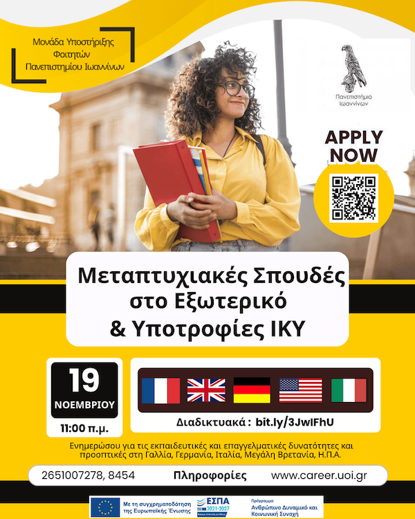 Πανεπιστήμιο Ιωαννίνων: Διαδικτυακή εκδήλωση με θέμα “Μεταπτυχιακές Σπουδές στο Εξωτερικό και Υποτροφίες ΙΚΥ”