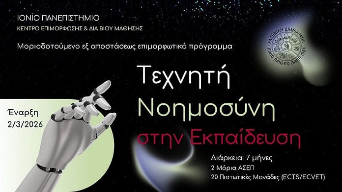 Το Ιόνιο Πανεπιστήμιο ανακοινώνει την έναρξη του νέου επιμορφωτικού προγράμματος «Τεχνητή Νοημοσύνη στην Εκπαίδευση», που θα πραγματοποιηθεί εξ αποστάσεως μέσω του Κέντρου Επιμόρφωσης και Δια Βίου Μάθησης (Κ.Ε.ΔΙ.ΒΙ.Μ.) από τις 2 Μαρτίου 2026 έως τις 2 Νοεμβρίου 2026.