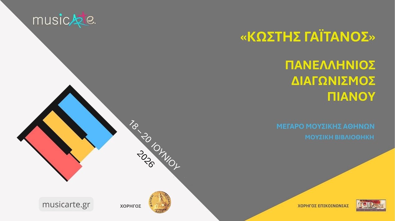 Η Μουσική Εκπαιδευτική Ομάδα musicArte διοργανώνει και φέτος, πανελλήνιους διαγωνισμούς Πιάνου, Κιθάρας και Εγχόρδων «Κωστής Γαϊτάνος», την Πέμπτη 18, την Παρασκευή 19 και το Σάββατο 20 Ιουνίου 2026 στο Μέγαρο Μουσικής Αθηνών.