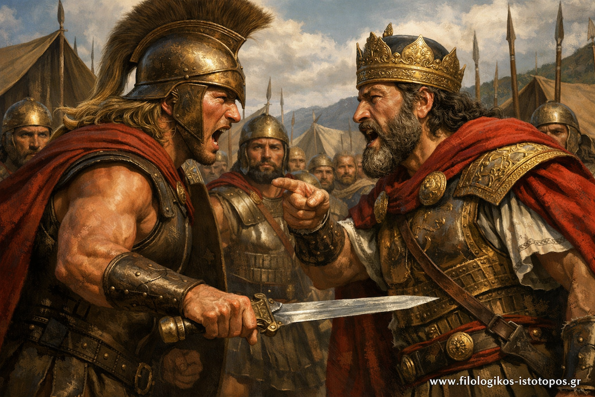 11. Ο Αχιλλέας αποκαλεί τον Αγαμέμνονα «σκυλοπρόσωπο», υπονοώντας την έλλειψη ντροπής και την αναίδειά του.