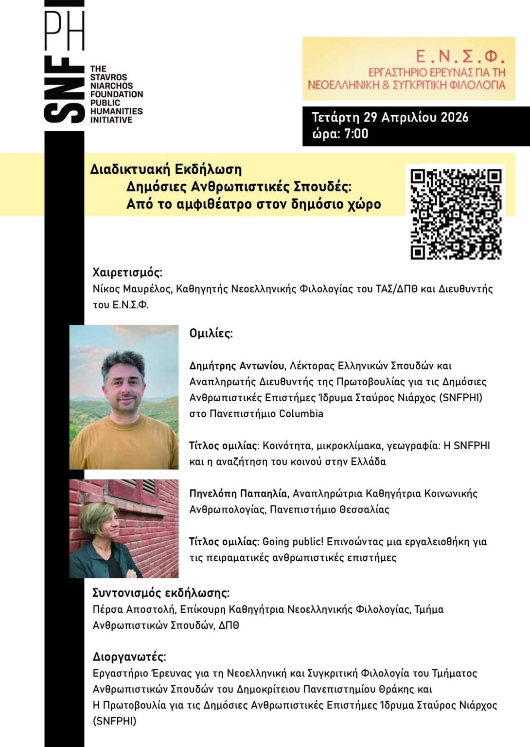 Η Πρωτοβουλία του Ιδρύματος Σταύρος Νιάρχος για τις Δημόσιες Ανθρωπιστικές Επιστήμες (SNFPHI) και το Εργαστήριο Έρευνας για τη Νεοελληνική και Συγκριτική Φιλολογία, Τμ. Ανθρωπιστικών Σπουδών ΔΠΘ συνδιοργανώνουν διαδικτυακή εκδήλωση με τίτλο: